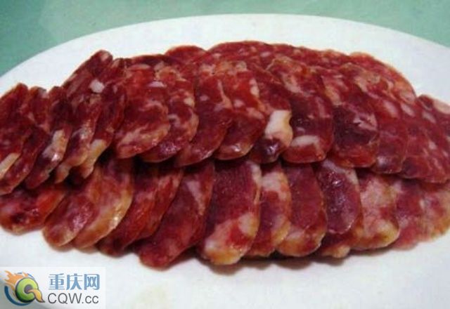 鮮豬肉用溫水洗凈,瘦肉切成胡豆粒大小的肉丁,肥肉粒約為瘦粒的一半大,然后加料拌腌。在肉料中加入食鹽、白酒、花椒粉、姜粉及其它香料,拌勻。即可灌入選好、洗凈的豬腸衣內(nèi)。灌餡時要用針刺腸衣,以排出空氣,每12至15厘米扎1個節(jié)。灌好的香腸,用溫水洗凈,掛在竹桿上,上火炕烘烤兩天。烘烤時,要適時翻動,炕溫保持在600C左右,防止跑油。加工好的香腸,應為腸身干爽,結(jié)實有彈性,瘦肉色澤鮮紅或暗紅色,肥肉色澤乳白而呈透明狀。成品紅白分明,鮮美爽口,佐餐下酒皆宜。