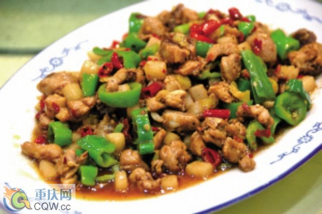 小煎雞的原料是農戶散養且未開叫的仔公雞和本地辣椒。連肉帶骨的雞肉爆干水分后,適量綠尖椒、花椒、姜、蒜等一同下鍋煎炒,炒到有香辣味時把剛剛爆好的雞肉倒下鍋一起翻炒,直到滿屋香氣,再加少量老抽醬油、白糖,翻勻以后起鍋裝盤,最后在裝好盤的雞肉上灑點白芝麻,一盤地道的小煎雞就做好了。辣中帶香,香中帶辣,看了讓人不停的吞口水。