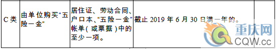 C類:務工人員(有合法的工作證明、勞務合同且由單位繳納“五險一金”之一,2019年6月30日滿一年)。