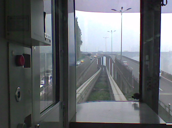 輕軌的速度不快,而且站與站之間的距離可以說很短。但是一路上,我們越過了江面,與汽車競速,又轉到高架橋下面,跟來向的輕軌車交錯還從左面的山崖邊繞過,多種形態和高低起伏,有點坐過山車的感覺(只是速度很慢的過山車),把我看得目不暇接。果然這趟漫游之旅挺值,要是天氣好視線清楚的話就更好了。