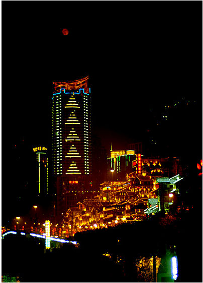 吃完飯,去了異域風情城市陽臺-------洪崖洞。洪崖洞整體業態分為紙鹽河酒吧街、天成巷巴渝風情街、盛宴美食街及異域風情城市陽臺四條大街。四條大街分別融匯了當下所有時尚元素,美國全球連鎖海盜酒吧等一系列全球知名酒吧的加盟。另我感覺奇怪的是,我坐電梯上了9樓,出了電梯,就是一條街,還停著許多車子,這種情況,在后面的兩天里也就習以為常了,這就是山城的特色之一嘛!