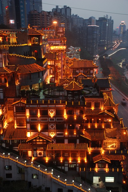 洪崖洞面向嘉陵江,主要是集餐飲、娛樂、購物等于一體的游覽場所。那里的渝菜館:小天鵝很有名,味道正宗,價格也不貴,有機會可以去嘗嘗。