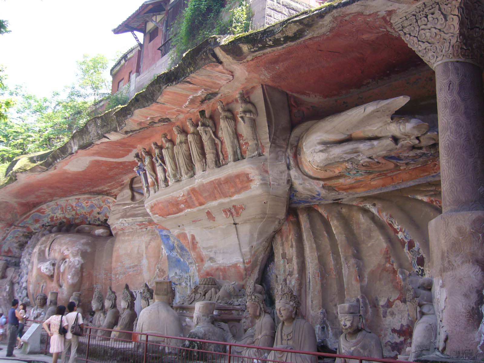 寶頂山的主要景區是大佛灣。景區的規模、石刻的數量不如我所到過的龍門石窟與云岡石窟,但是雕像的精美毫不遜色,也因為形成年代晚于龍門和云岡,保存得比較完整。與眾不同的是,這里的石刻題材很有兼容性,佛、道共存,也有百姓生活化的內容。進門不遠,兩尊石像“道祖乘牛登岸上,君伏虎鎮橋頭”,還有道家教人平心靜息的姿勢。再往前,有一組牧牛雕刻,由一個個小故事、幾十個人、牛組成,牛在道家的說法中代表內心的欲望,整組雕刻表現的是人如何控制自己的欲望。中心景區以佛教內容為主,佛祖與文殊、普賢兩位菩薩的立像,釋迦涅磐臥像,眾菩薩羅漢聽經,眾金剛,天龍八部,地藏王菩薩,孔雀明王,柳本尊,六道輪回,地獄眾司,父母恩重像……其中最精彩最細致的是千手觀音,在一面八十八平方米的崖面上,中間觀音菩薩雙手合十坐像,身后如孔雀開屏般伸展1007只手,持400多件法器,手的姿勢、法器無一雷同,整座像涂以金漆,金碧輝煌,嘆為觀止。大佛灣石刻還到處巧妙地體現了排水、采光、力學、防風化等科學措施,八百年前的工程水準足以媲美當今。在景區內無意聽到一句很搞笑的話,一位女士和同伴談論:有那么多雕像?我還以為大足石刻不就是一只石刻的大腳嗎!其實大足的地名由來是取意“大豐大足”,寄望國泰民安,百姓衣食無憂。