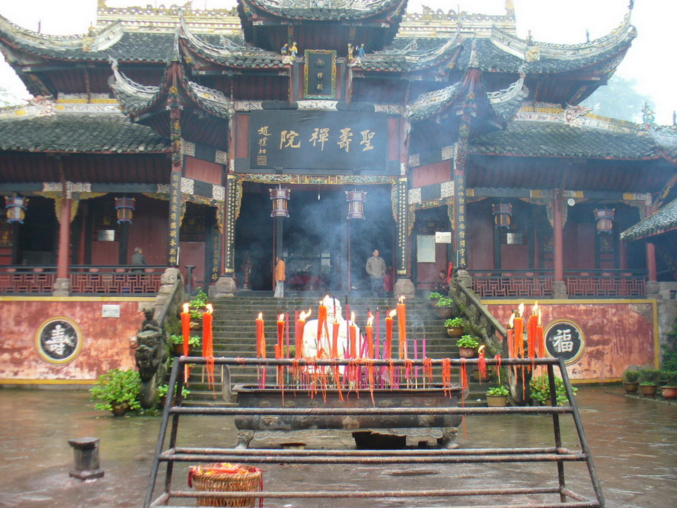 出門寶地石刻已是14:40分,看看也就不到2小時就結束了游程,遂準備離去趕車,左行不走回頭路的下山。剛走了沒多遠便遠遠看見了“寶頂”的石牌坊,看看沒人下行不知有多遠距離,返回準備問人時看見一大門正好打開,一俗家居士模樣的人出門,遂問問這是哪里,答圣壽寺,遂走了進去。寺廟不大,依次走過4、5座廟堂,好像香火比較旺盛的樣子,到處青煙裊裊。微笑婉謝殿前請香的大媽,直接前門出去,回頭看時才看見20元的售票處,哦!敢情這里要門票的,我真正是走了個后門,不知不覺逃了一次票,那位居士居然不吭氣放我進來了,呵呵。
