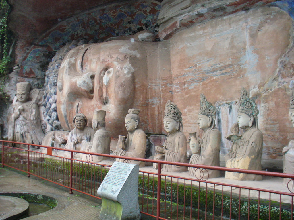 出門便是寶頂石刻的精華之地,長31米高7米的釋迦臥佛,微閉雙眼在那里側臥涅磐(介紹石碑上是涅槃,哪個字正確呢),不懂佛教的我只能說是比較安詳,也看不出什么圓寂的圣跡味道。但是相比其它刻像,宏大得多。臥佛身前端坐幾尊弟子半身造像。聽導游講講,臥佛鼻前一尊者,其實是雕刻者自己的造像。難怪啊,面部表情明顯生動和凡人化,頭上無佛教弟子冠帽,只有一頭的卷發。為何是卷發,不明白了,難道這雕刻者是印度古人士,還是那時巴渝的石匠崇尚佛教,頭頂一頭印度卷毛乃是當時禮佛的時尚?估計是后者。臥佛前是連環半圓彎曲的泄水道,起到將石崖上的雨水排出的作用。游客到此大多駐足長時間,拍照也有人舉手膜拜。