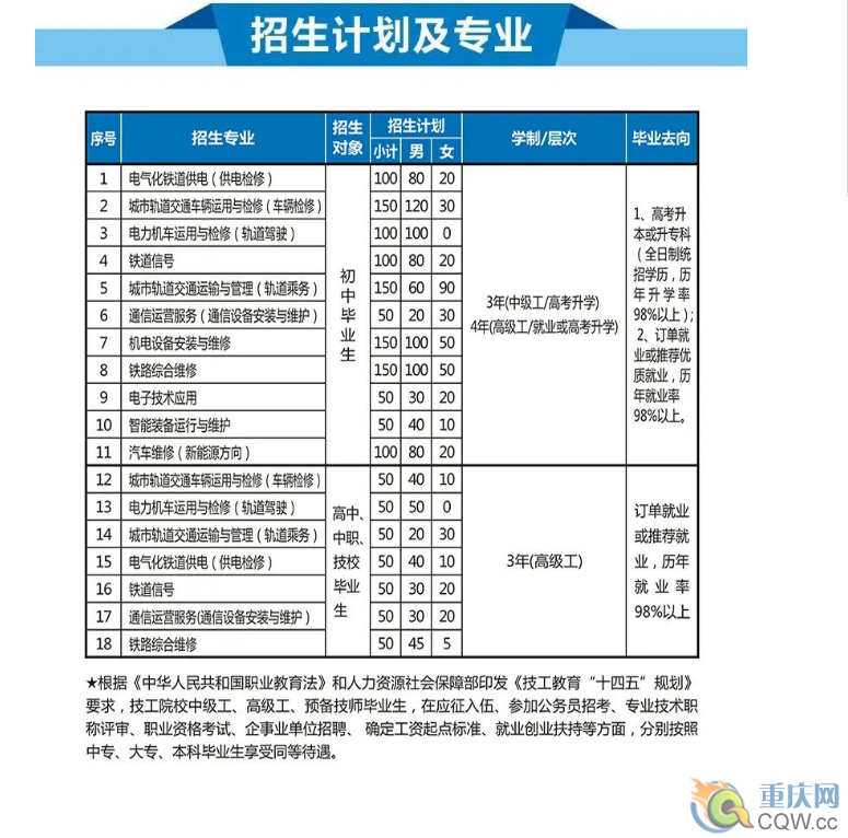 重慶鐵路運輸高級技工學校2023年招生計劃及專業