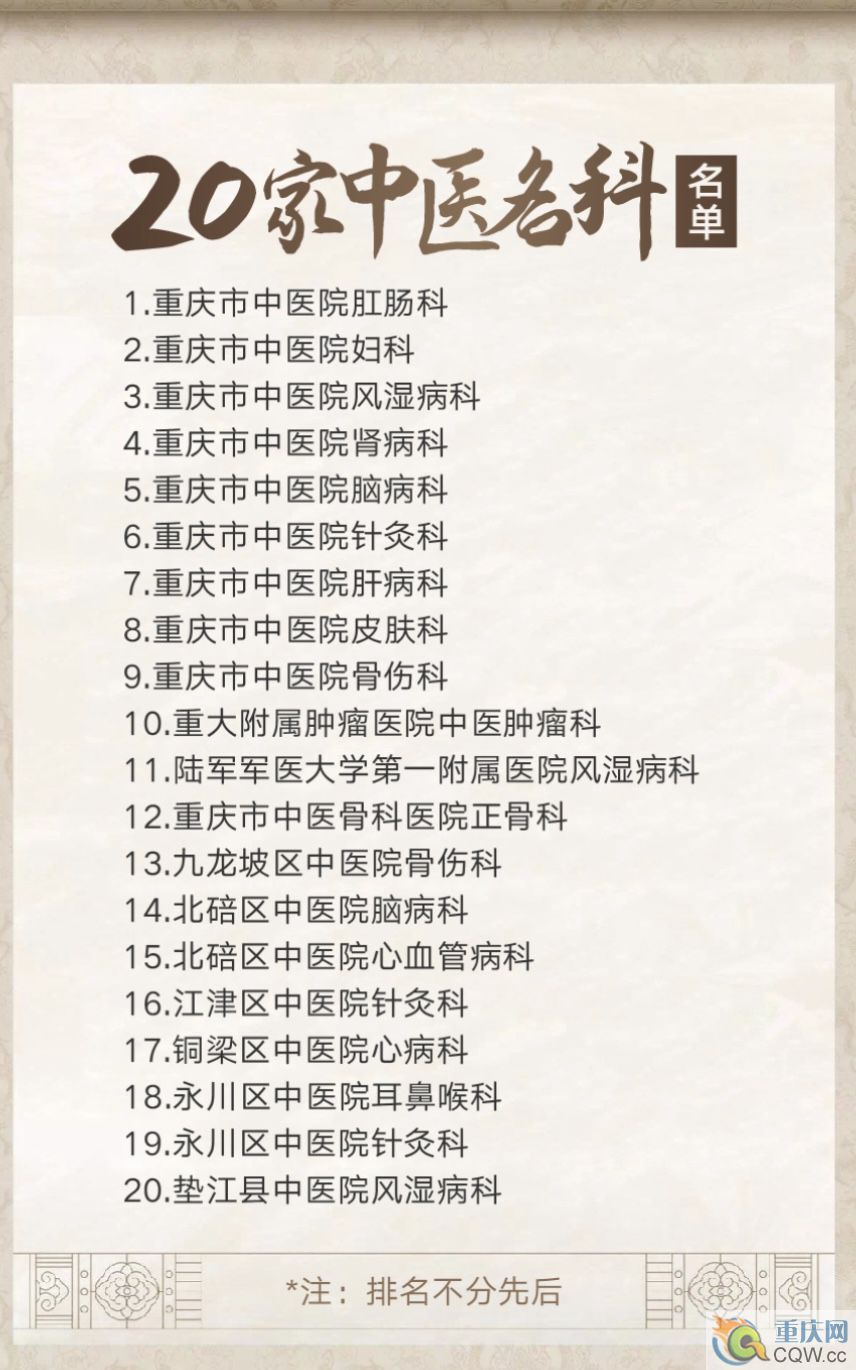重慶市中醫(yī)院肛腸科、重慶市中醫(yī)院婦科、重慶市中醫(yī)院風(fēng)濕病科、重慶市中醫(yī)院腎病科、重慶市中醫(yī)院腦病科、重慶市中醫(yī)院針灸科、重慶市中醫(yī)院肝病科、重慶市中醫(yī)院皮膚科、重慶市中醫(yī)院骨傷科、重大附屬腫瘤醫(yī)院中醫(yī)腫瘤科、陸軍軍醫(yī)大學(xué)第一附屬醫(yī)院風(fēng)濕病科、重慶市中醫(yī)骨科醫(yī)院正骨科、九龍坡區(qū)中醫(yī)院骨傷科、北碚區(qū)中醫(yī)院腦病科、北碚區(qū)中醫(yī)院心血管病科、江津區(qū)中醫(yī)院針灸科、銅梁區(qū)中醫(yī)院心病科、永川區(qū)中醫(yī)院耳鼻喉科、永川區(qū)中醫(yī)院針灸科、墊江縣中醫(yī)院風(fēng)濕病科