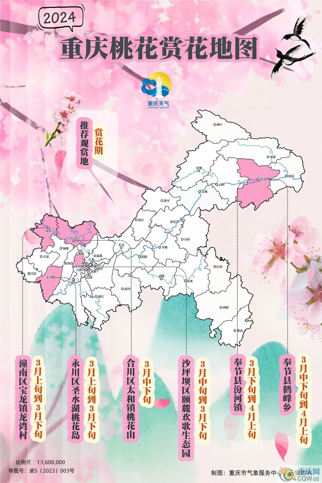 “桃花春色暖先開,明媚誰人不看來”。每年3月是踏青賞花的好時節。眼下,重慶多地桃花已經開始吐露芬芳,一幅幅春日美景圖正在陸續上線。在此,重慶天氣特別制作《重慶2024年桃花賞花地圖》,邀你一起打卡春日美景,盡享唯美風光